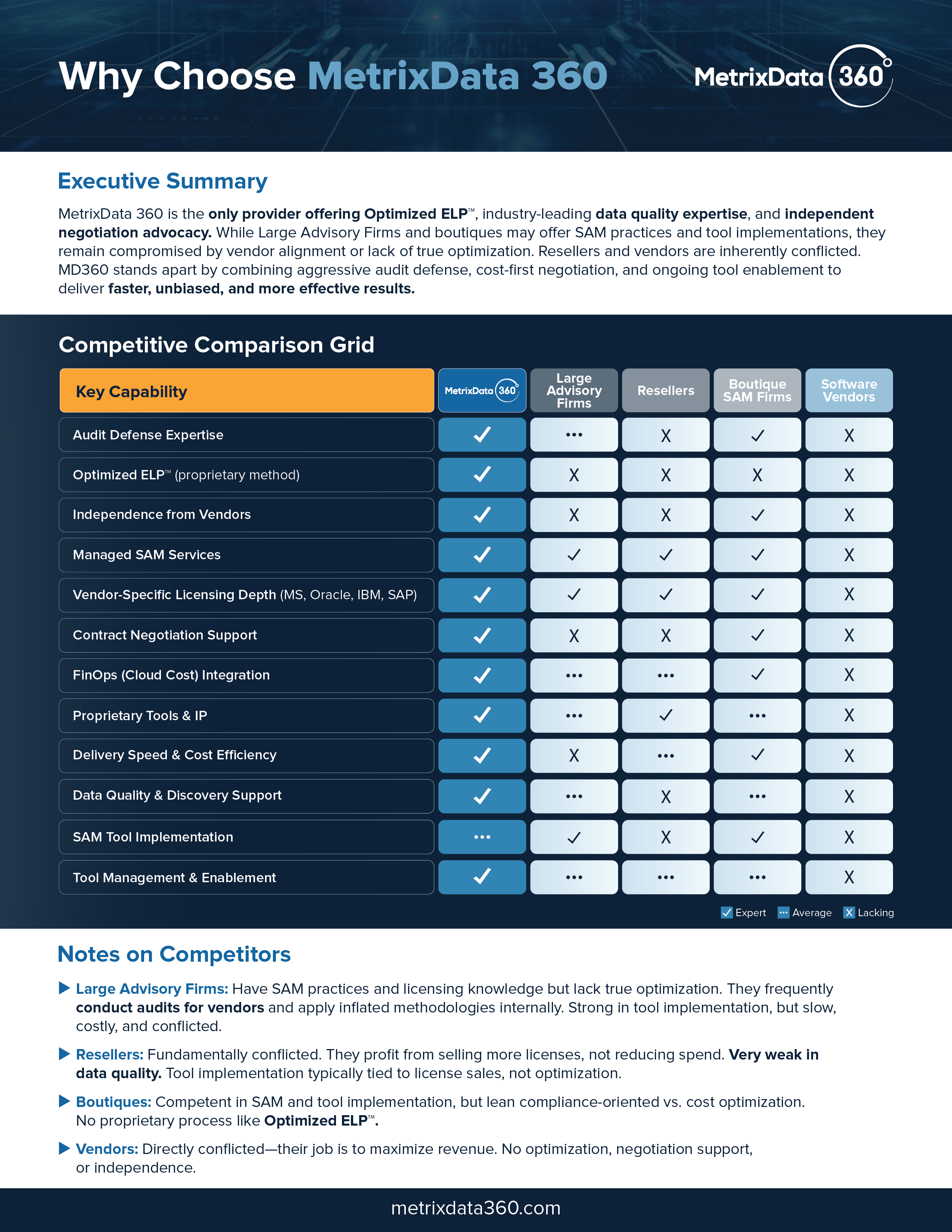 At MetrixData 360, we’ve built our reputation on being different. We created an easy-to-follow comparison grid to surface the key differences between various industry players.